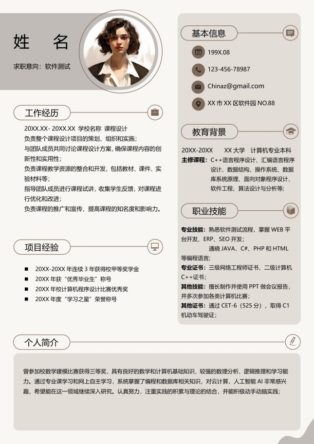 简介:软件测试应届生带照片简历模板,适用于软件测试、通用简历、求职简历、个人简历、商务简历、找工作简历、竞聘简历等相关的个人简历主题设计应用。